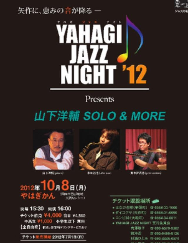 山下洋輔氏(YAHAGI JAZZ NIGHT 2012年は山下さんでした。)とのつながり、永田利樹氏とも長い付き合いがあり、矢作に2013年に一度来られています。