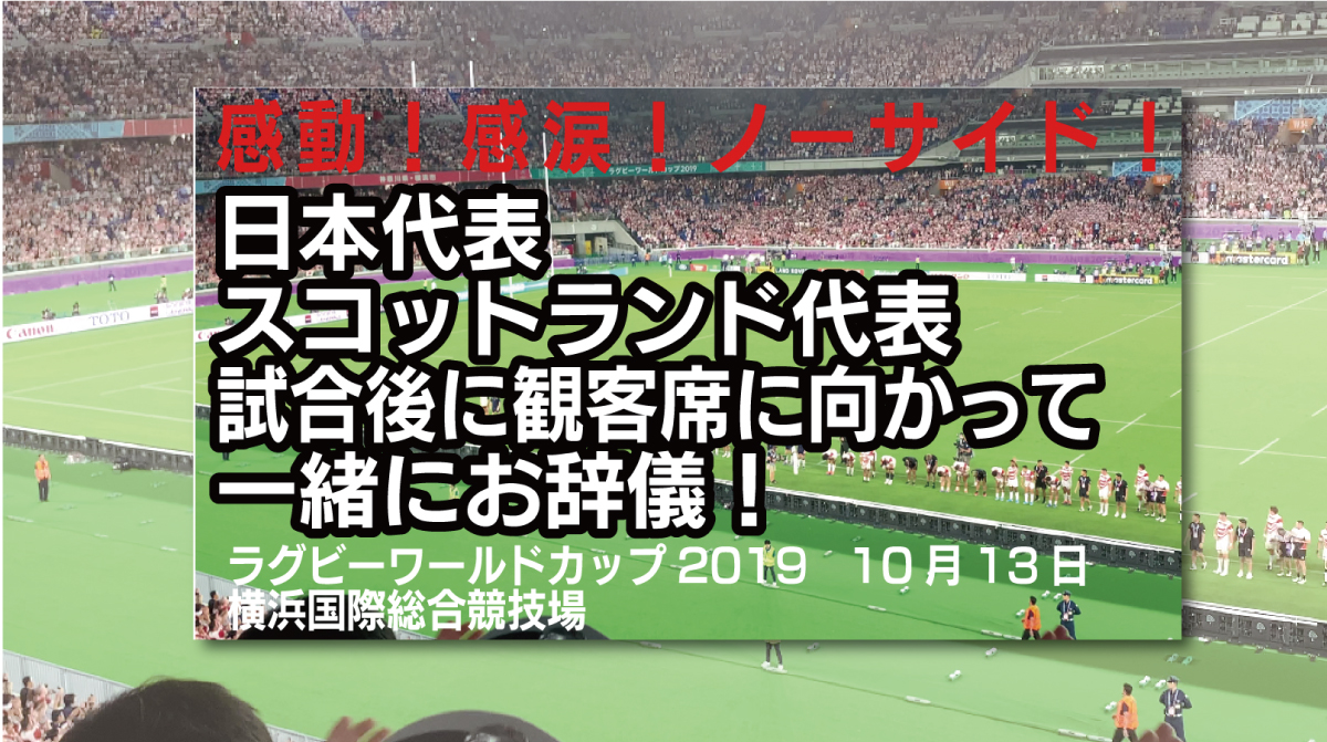 去る10月13日のラグビーワールドカップ 日本 vs. スコットランド戦 試合後、僕らのいたEast Sideのスタンド前で日本代表の整列とお辞儀、そして!スコットランド選手団も来て一緒にお辞儀!日本は合わせて二度目のお … 記録|ノーサイド編|ノーサイドですね!スコットランド選手団も来て一緒にお辞儀!